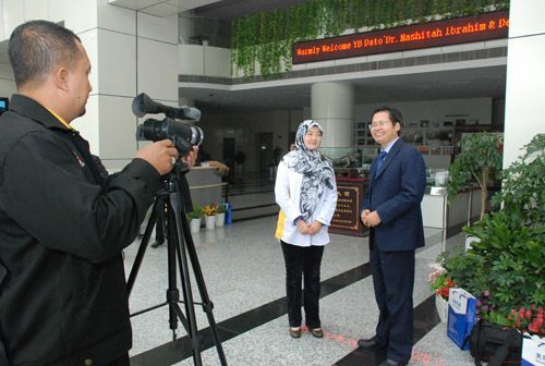 参观结束后,刘召贵博士与Dr.Mashitah Ibrahim大臣、YaPEIM公司主席Dr.Malek、首席执行官Mr.Abi、文莱国家银行顾问一行人举行亲切会谈。“非常荣幸能够接待来自马来西亚的贵宾。过去的一年中,天瑞与马来西亚政府直属的YaPEIM公司建立了诚信、共赢的合作关系,希望双方的友谊能够长存。”刘召贵博士在欢迎辞中表示。Dr.Mashitah Ibrahim大臣说,这是她第一次来到中国,而天瑞仪器不断创新的研发技术、热情有素的员工、整洁大气的办公环境让她印象深刻。她希望马来西亚能与天瑞仪器建立更大范围、更加深入的合作关系。会谈结束,双方互赠了代表彼此美好祝福的礼物,马来西亚客人还邀请刘召贵博士在摄像机前发表感言,作为“永久的纪念”。