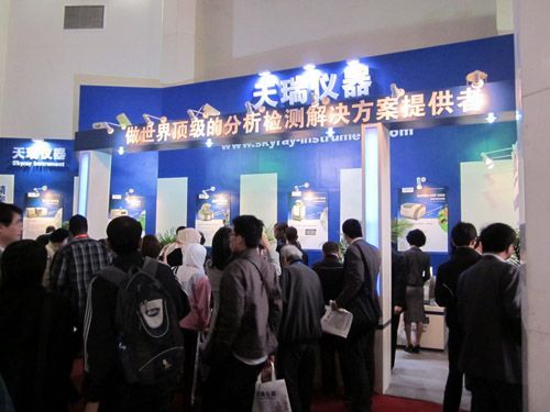 天瑞展位号为T2,位于北京展览馆正门入口右侧的第一个展位:湛蓝的展台被设计成扇形,并融入图文展板、多媒体影像、仪器实物等多元展示形式。“做世界顶级的分析检测解决方案的提供者”几个立体大字更是清晰可见。展会首日,天瑞展位即迎来上千名参观人次。参观人员分别来自国内各大高校、科研机构、各行业企业,以及土耳其、丹麦、荷兰、印度、沙特阿拉伯、马来西亚、巴基斯坦等国际参观团。